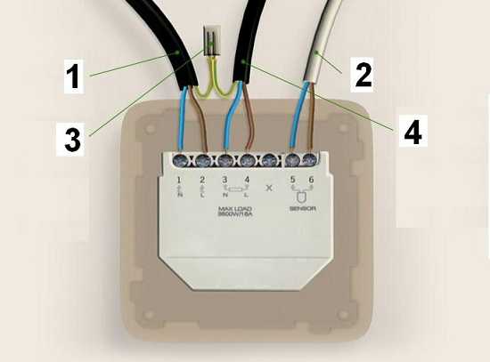 - Подсоедините провода нагревательного элемента к «гнездам» 3 и 4, где к контакту 3 подключается ноль (N), а к контакту 4 — фаза (L).