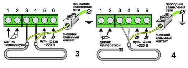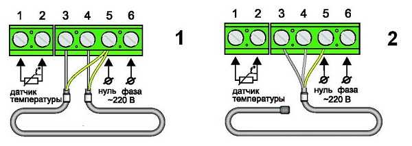 Во всех схемах подключения датчик температуры подключается к первому и второму контакту клеммной колодки. На самом устройстве эти контакты маркированы соответствующей надписью или рисунком.