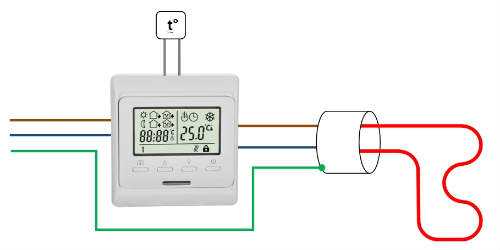 А из распаечной коробки выводится только два провода, которые и подключаются к терморегулятору по основной схеме.