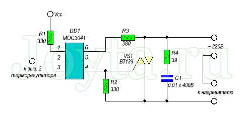 Электрическую развязку цепей термостата и нагревательного элементом теплых полов можно осуществить при помощи недорогого оптосимистора MOC3041. Ниже приведена схема подключения в связке с симистором BT139.