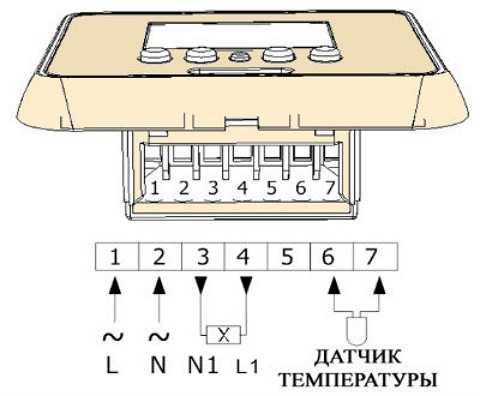 Схема подключения терморегулятора от производителя изображена на корпусе. Независимо от типа управления любая модель имеет распределительную колодку для подсоединения проводов электрических. Это семиконтактная колодка со следующими функциями контактов: