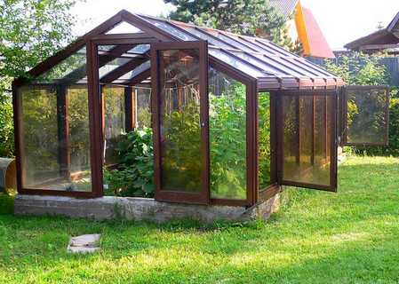 - Круговое деревянное строение напоминают небольшой павильон, имеющий много углов. Чтобы в такой теплице хорошо циркулировал воздух, в ней необходимо установить дополнительные форточки или даже окна.