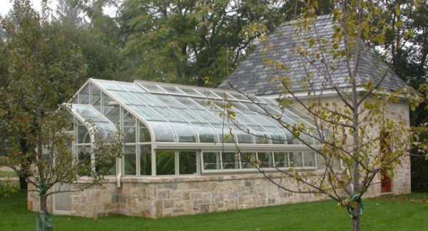 Прекрасная теплица из поликарбоната с основанием из камня