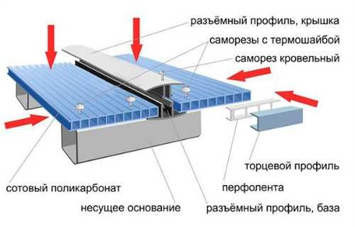 Монтаж листов поликарбоната делается с помощью саморезов