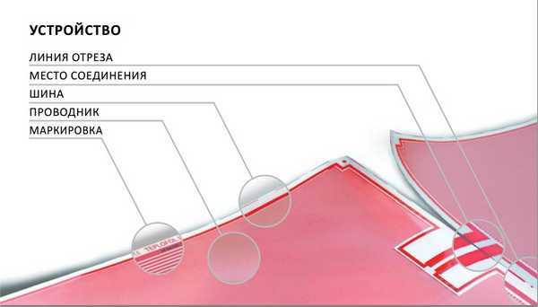 Нагревательный элемент помещают между двух слоев плотного полимерного материала. Эти полосы, ширина которых составляет примерно 15 мм, соединены специальными токопроводящими медными шинами, защищенными серебряным покрытием.