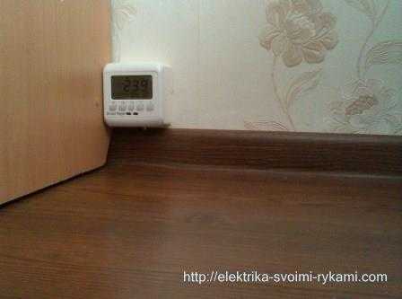 Собрав все, подключаем к установленному на стене терморегулятору. К нему же подключаем датчик температуры, который располагаем посередине между стержнями (зафиксировать можно скотчем). Закончив подключение, включаем систему, выставляем 30оС и внимательно наблюдаем. Если искрения, странного запаха нет, все полосы греются, значит — все сделали правильно и можно приступать к заключительной стадии монтажа.