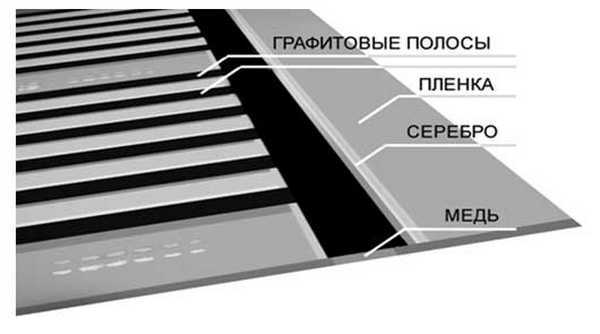 Нагревательным элементов инфракрасного теплого пола служит гексагональная улеродная нанорешетка, заключенная в два слоя прочного полимерного покрытия и соединенная медными шинами, покрытыми слоем серебра