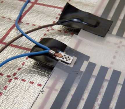 Для подключения пленочного инфракрасного теплого пола к системе электроснабжения можно использовать специальные заклепки или метод спайки с медной проволокой