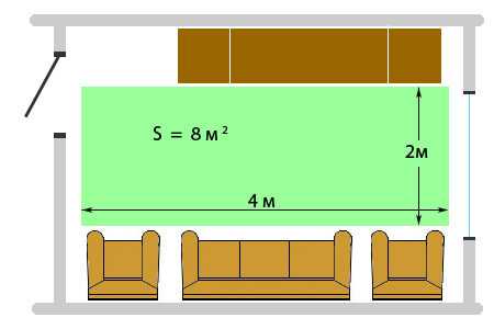 К примеру, нам нужно рассчитать теплый пол по площади гостиной 25 м 2. Условно рассчитаем полезную площадь комнаты. Так как в гостиной у нас установлен диван, кресла, столик и шкаф, полезная площадь будет всего лишь 60% от общей.