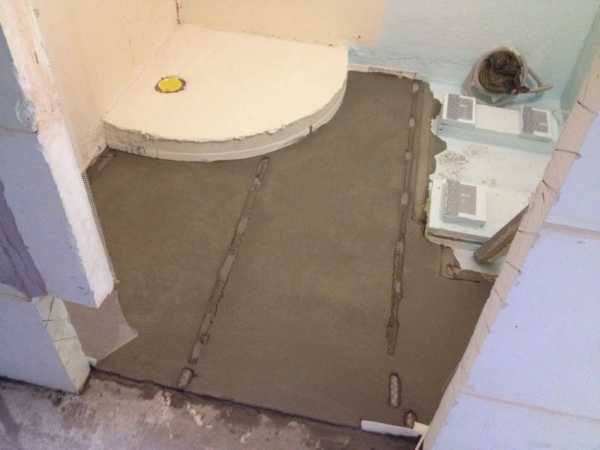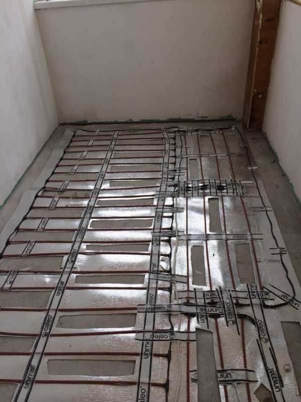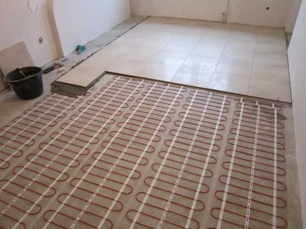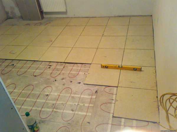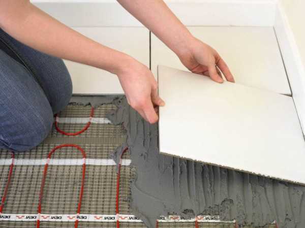 После проверки системы на работоспособность, поверх матов делается небольшая стяжка, поверх которой клеится кафельная плитка.