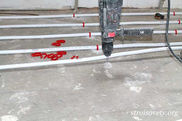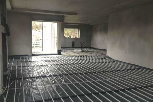 Перед заливкой стяжки систему для проверки заполняют воздухом. Залив бетон выравнивают поверхность и оставляют до полного высыхания, которое длится три-четыре недели.