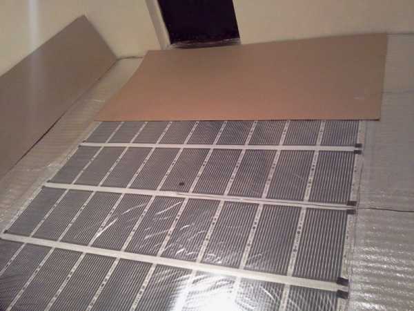 Рекомендуется сделать перед монтажом инфракрасных теплых полов дополнительную гидроизоляцию пола в ванной при помощи жидкого стекла, битума или рубероида. После высыхания гидроизоляции, стелют утеплительную пленку, соединяя скотчем стыки.