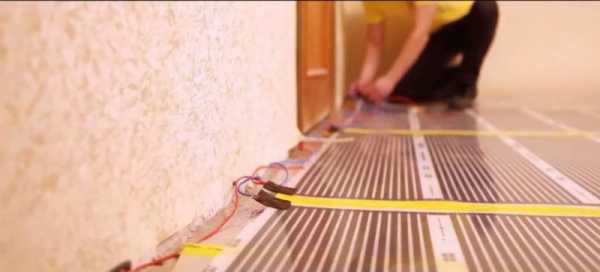 Место для размещения терморегулятора выбирается так, чтобы электропроводка находилась в максимальной близости, а доступ к нему не был перекрыт предметами окружающей обстановки. После установки терморегулятора провода раскладываются по схеме подключения. Далее производится соединение всех полос пленки в цепь. На концах медной полосы закрепляются контактные зажимы, при помощи которых происходит подключение термопленки к проводам. Места разреза полосы и точки подсоединения проводов должны быть тщательно заизолированы. Заключительным этапом служит подключение термодатчика к терморегулятору. Укладка финишного напольного покрытия производится только после тестирования собранной системы. Нагрев поверхности должен происходить равномерно, места соединения проводов проверяются на отсутствие перегрева и искрения. При достижении положительного результата переходят к укладке напольного покрытия.