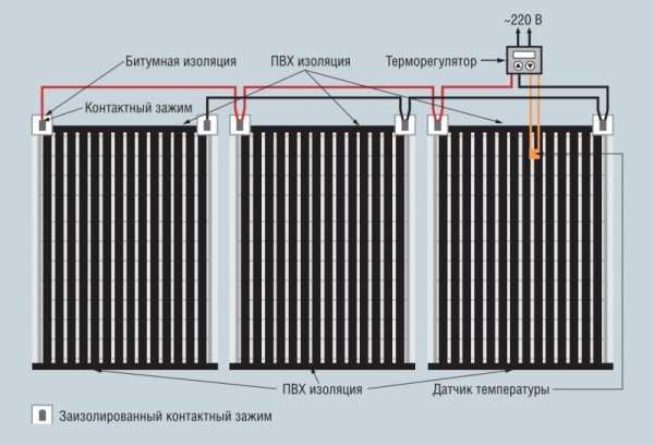 Таким образом, с помощью электричества нагревается углеродный материал. Так происходит обогрев помещения. При этом шины объединены в секции, которые, при необходимости, можно разделить. То есть, если одна из секций придет в негодность, можно убрать её, не заменяя ленту полностью.