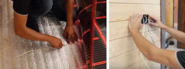 Во всех местах, где Вы изолировали пленку и где подключаются провода необходимо вырезать нишу в теплоотражающей подложке, чтобы ничего не выпирало, и покрытие было ровным. Такие же ниши нужно сделать для проводов. Устанавливаем терморегулятор и подключаем его. Процесс укладки инфракрасного теплого пола на деревянный пол закончен, осталось все протестировать и уложить финишное напольное покрытие.