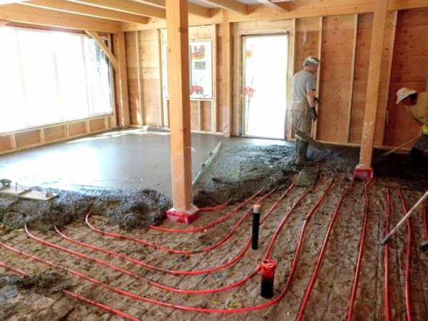 Водяной | Может затягиваться цементно-песчаной стяжкой, заливаться выравнивающими смесями, накрываться фанерой или плитами ОСП. Первый вариант не рекомендуется из-за большого веса. Накрытие плитами понижает нагрузки на половые несущие элементы, но уменьшает эффективность системы – пиломатериалы плохо проводят тепловую энергию, значительная часть уходит на непродуктивный обогрев перекрытий. Водяная система считается морально устаревшей и применяется только в тех случаях, когда монтаж других систем по каким-либо причинам невозможен. |