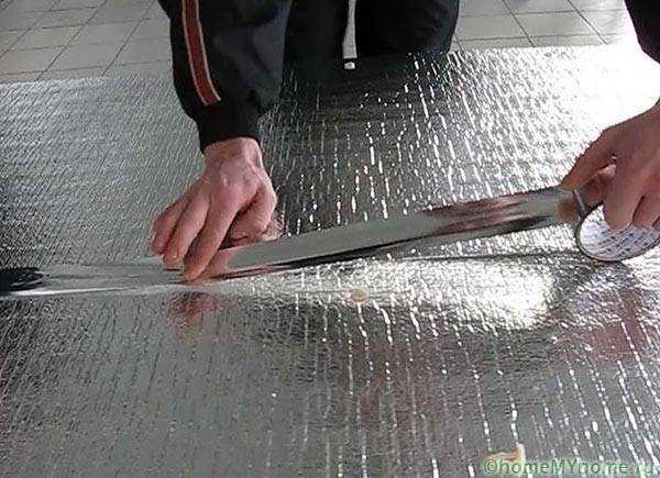 После того как мы выровняли покрытие нам необходимо постелить теплоотражающую пластину в виде вспененного утеплителя с фольгой. Это нужно для того чтобы тепло отражалось вверх, а не тратилось на прогрев не нужной части пола. Данный утеплитель кладется фольгой вверх зафиксировать его можно с помощью строительного степлера.