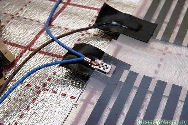 подключение клеммыПосле установки клемм можно приступить к монтажу термодатчика. Термодатчик необходим для контроля температуры нагрева. И подключается он в терморегулятор, который Вы установите, где захотите. Монтируется данный датчик к низу пленки на черную карбоновую пластину с помощью все той же битумной изоляции. Чтобы датчик не выпирал в теплоотражающей изоляции необходимо вырезать место для него.