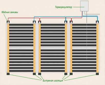Пленку стелить необходимо медными шинами вниз, это необходимо для дополнительно защиты от поражения электрическим током. Так как когда токопроводящие шины направленные вверх создают большую долю вероятности контакта с напольным покрытием.