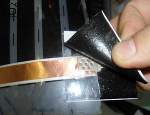 изолирование пленки в местах разрезаПосле разреза и укладки пленки первым делом необходимо изолировать медные шины в местах разреза специальной изоляцией на битумной основе, которая идет в комплекте. Помните, что изоляция должна закрывать по всему срезу серебряные пластины, которые соединяют медную шину с карбоновыми пластинами и находятся по краям пленки.