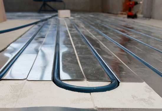 - Трубы системы водяного теплого полка укладываются в пазы профиля из алюминия.
