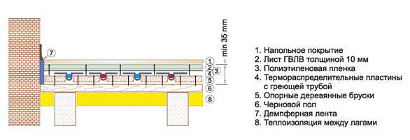Рейки составляют опорную конструкцию, на которую осуществляется непосредственно укладка труб отопительного контура. При монтаже теплого пола по данной технологии допускаются неровности основания в пределах 2 мм на 1 погонный метр. Гидроизоляцию делают из полиэтиленовой пленки толщиной в 200 мкр. Обязательным элементом всей конструкции является демпферная лента. Раскладка осуществляется поперек лагов или опорных досок. После укладки труб их обкладывают со всех сторон опорными планками. Контур вкладывают в пазы в соответствии с планом, либо змейкой, либо улиткой.