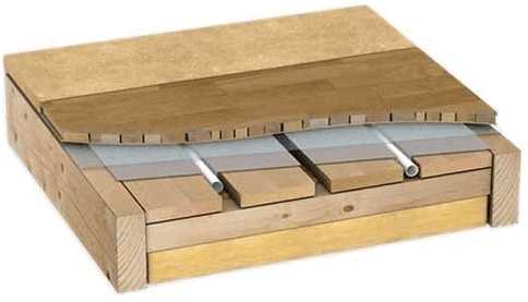 Наиболее рациональным вариантом обустройства пола для домов с перекрытием из дерева есть так называемая легкая «сухая» система укладки пола. Из характера названия вытекает принцип ее применения: «сухой» способ укладки сочетается с легкой по весу технологией. Речь идет о укладке пола из деревянных или полистирольных материалов (полоски из дерева, ДСП, плиты из соответствующего материала), из которых формируется основания пола. Также в систему данной технологии укладки входят согревательные трубы, которые после укладываются в пазы металлических теплораспределяющих пластин. На конечном этапе укладки легкий пол укрывается гипсоволокнистыми листами.