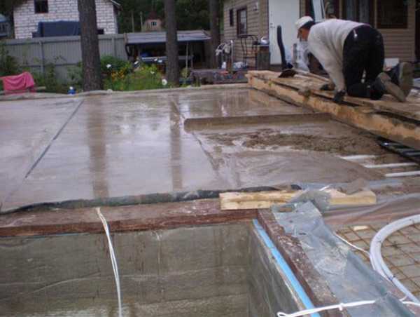 После этого, заливается слой из цементной смеси, он также служит дополнительной изоляцией. Толщина его должна быть 4 — 5 см, чтобы состав не растекался, его необходимо оградить рейками.
