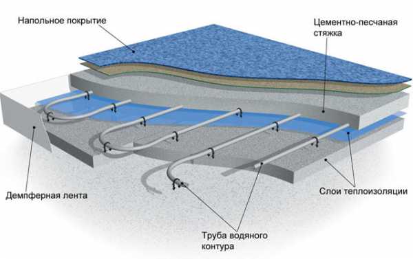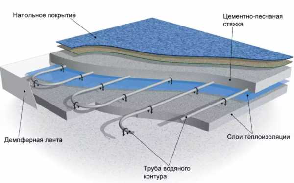 Структура теплого водяного полаТолщина всей конструкции, в первую очередь, зависит от толщины применяемого слоя утеплителя и мощности стяжки, а так же от диаметра, применяемых для создания теплого водяного пола, трубопроводов.