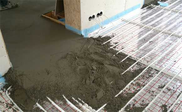 Теперь вы знаете, как устроен водяной теплый пол и самое время разобраться с монтажом финишной стяжки, которая играет немаловажную роль в общем процессе обустройства напольных водяных полов. Монтаж поверхностной финишной бетонной стяжки, после установки сети трубопроводов, обогреваемых пол, производят следующим образом:
