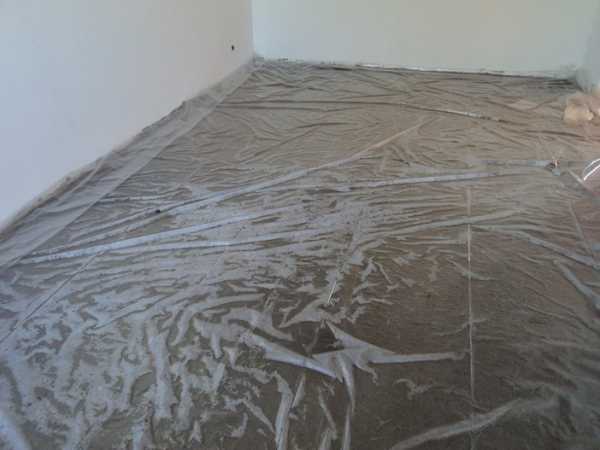 Гидроизоляционным материалом застилаем подготовленное основание. Для создания качественной паро- и гидроизоляции советуют применять пленку из полиэтилена толще 250 мкм. Вряд ли можно найти пленку равную той площади, которую имеет ваша комната. Поэтому полотнища такой пленки необходимо укладывать внахлест. Стоит отметить, что такой нахлест должен быть около 12см., соединяя шов при помощи скотча. При этом необходимо на стены сделать напуск пленки, тем самым создать своего рода «корыто». При окончании всех подготовительных работ излишки гидроизоляционной пленки срезают ножом.