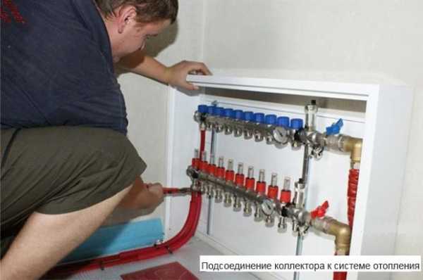 На поверхности стены, ближе к полу, делается ниша для установки коллекторного шкафа, куда он впоследствии и монтируется. Если нет возможности сделать проем под шкаф, то его можно и не встраивать в стену, а установить вплотную к ее поверхности и закрепить, но выглядит это не очень эстетично, а иногда и громоздко. В первую очередь в шкаф заводят концы возвратной (обратка) и подающей (прямая) трубы.