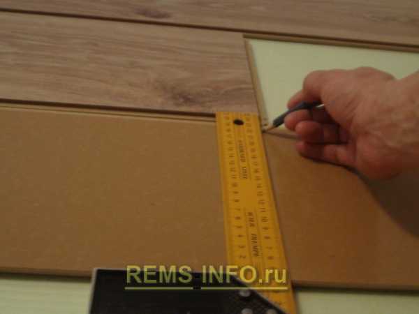Для этого прикладываем целую панель к окончанию ряда замковым соединением к стене и отмечаем место среза относительно последней панели.