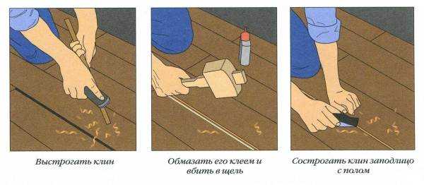 - Укрепить доски в местах расхождения. Для этого используют специально выточенный клин, его вбивают в щель, после чего промазывают шпаклевкой;
