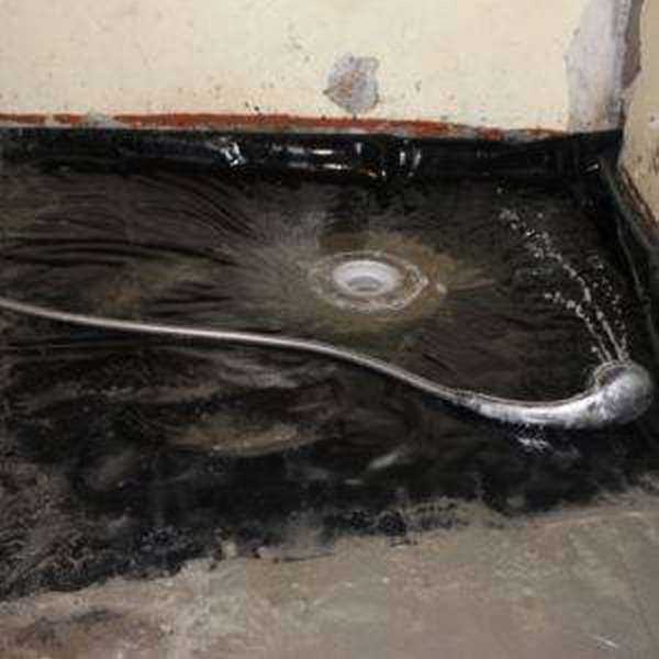 Засохшая стяжка покрывается гидроизоляцией, в которой предварительно прорезано отверстие для слива. Изоляция должна перекрывать прокладку и заходить на стены на высоту, которая примерно равна следующему слою бетонной стяжки. Затем устанавливается сифон.