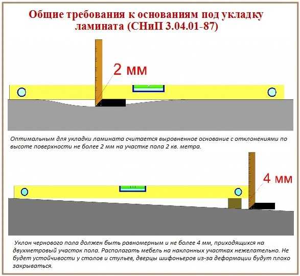 Допустим равномерный уклон плоскости чернового пола в пределах 4 мм, приходящимся на 2 м². Однако стоит отметить, что на участках с уклоном не желательно расставлять мебель.