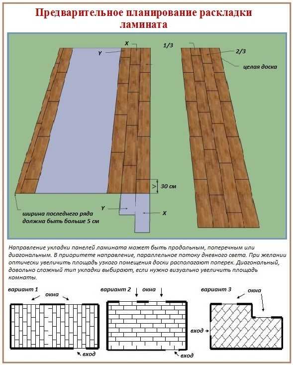 С целью экономии ламината необходимо заранее рассчитать количество досок и определиться со способом раскладки. В этом поможет схема расположения панелей. Покупать их нужно с запасом, примерно на 5-7 % больше при прямой укладке и на 15 % при монтаже по диагонали.