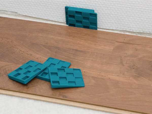 Между стеной и напольным покрытием обязательно должна оставаться щель, чтобы ламинат имел необходимое пространство для расширения. С этой целью между доской и стеной выставляются колышки, толщиной 0,5−1 см, через каждые 25−30 см. В качестве распорок отлично подойдут отрезанные кусочки ламината.