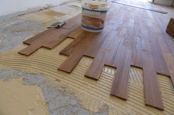 Рассмотрим каждый вид в отдельности. Прежде чем положить паркет на бетонную стяжку, пол грунтуют, измеряют уровень влажности. Он не должен превышать 2%. Далее основание грунтуется. Высыхает грунтовочный слой не менее 8 часов. На грунтовку укладывается влагостойкая фанера. Каждый лист фанеры разрезается на 4 равные части размером 50 на 50см. Фанера монтируется к готовому основанию . Далее укладывается паркет.