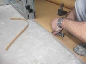 Доставленный из магазина рулон линолеума не желательно держать скрученным достаточно долго, потому что укладывать его будет гораздо труднее . Расстелите линолеум по всей комнате и дайте ему отлежаться для усадки, перед этим предварительно вырезав его по периметру комнаты .Для этого нужно отметить карандашом места соприкосновения со стеной, соединить метки и отрезать строительным ножом излишки между стеной и линолеумом. Необходимо оставлять зазор в 1, лучше полтора сантиметра для. компенсации расширения между ними. Небольшая щель закроется плинтусом, ее не будет видно.