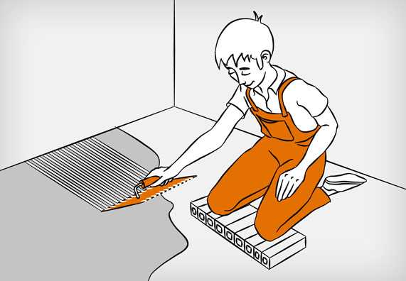 После короткого периода созревания клея, нанесите слой толщиной 5-10 мм равномерно на пол с помощью шпателя. Затем разгладьте клей с помощью зубчатого шпателя таким образом, чтобы он равномерно уложился на поверхность. Размер зубцов шпателя зависит от величины напольной плитки.