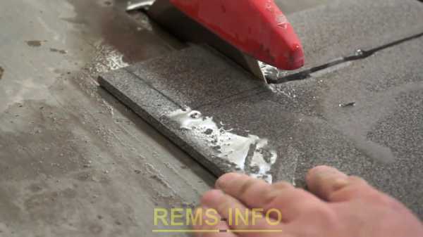 Вываливаем прямо на плитку небольшой кусок смеси, и с помощью шпателя для затирки втираем его в швы. Не бойтесь запачкать плитку, состав можно смыть в течении часа-полутора.