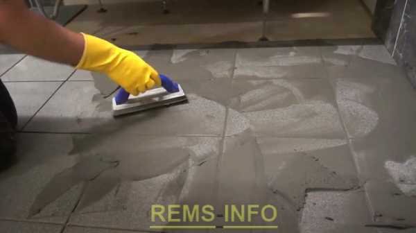 Вылейте раствор в швы на полу и распределите его с помощью резинового шпателя. Тщательно удалите излишки раствора. Обязательно защитите себя резиновыми перчатками при работе с раствором.