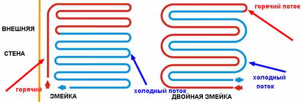 При укладке змейкой наблюдаются наибольшие потери тепла из-за того, что подача нагретой воды происходит только с одной стороны и теряет всю энергию, когда доходит до конца схемы.