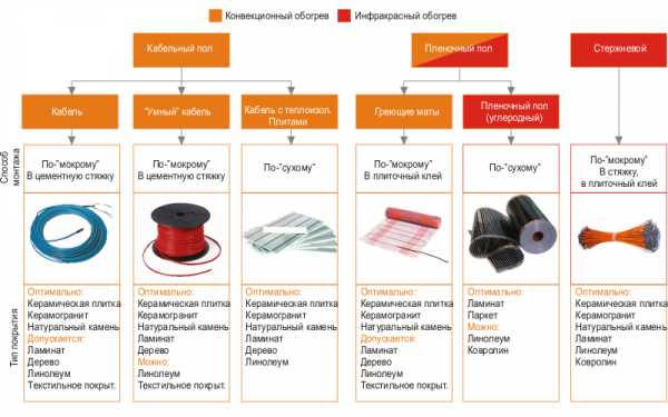 Теплый пол делится на несколько типов, каждый из которых обладает своими недостатками и преимуществами: