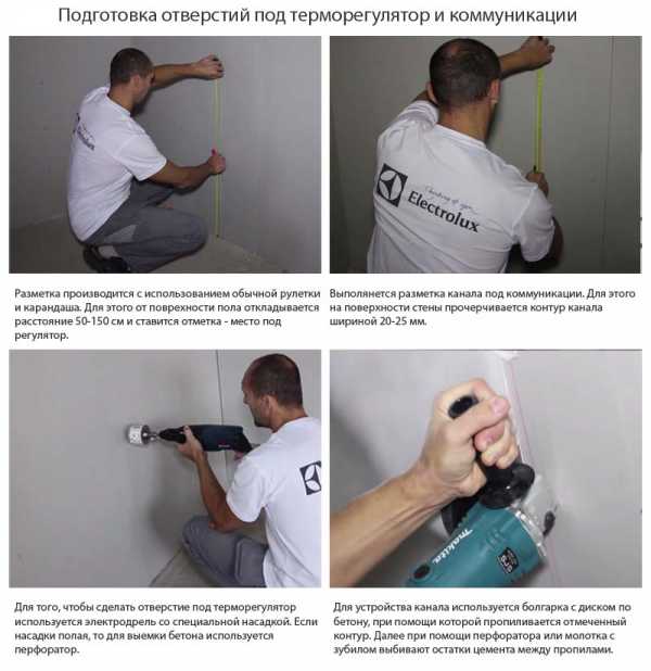 Подключение терморегулятора может быть как внутренним, там и наружным. Чтобы сделать внутреннее подключение, в стене необходимо сделать углубление, после чего проштробить в ней отверстия для проводов. Если необходимо установить терморегулятор с наружной стороны, то здесь потребуется установка на стене специального пластикового короба.