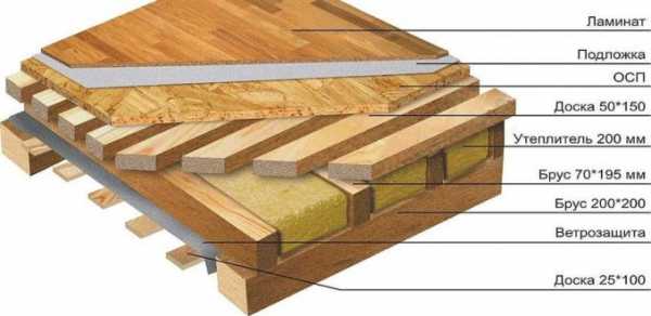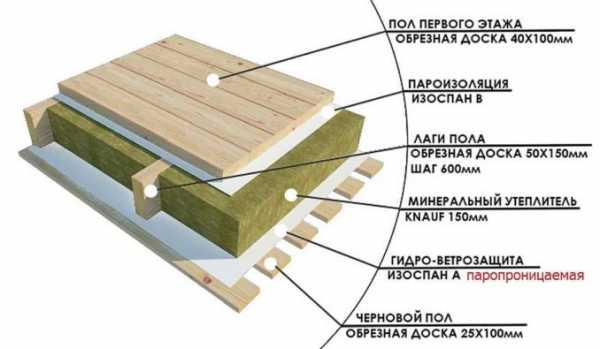 Схема деревянного пола с утеплителем в разрезе.