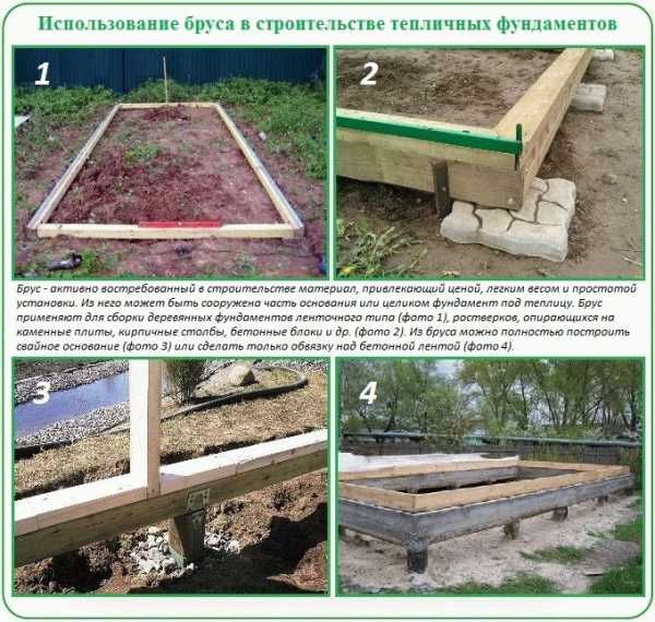 Наиболее дешевый, легкий в исполнении и недолговечный. Представляет собой каркас из деревянного бруса сечением от 10х10 см до 15х15 см в зависимости от величины самой теплицы. Сооружения крупнее 3х6 м уже нуждаются в более серьезном, капитальном основании.