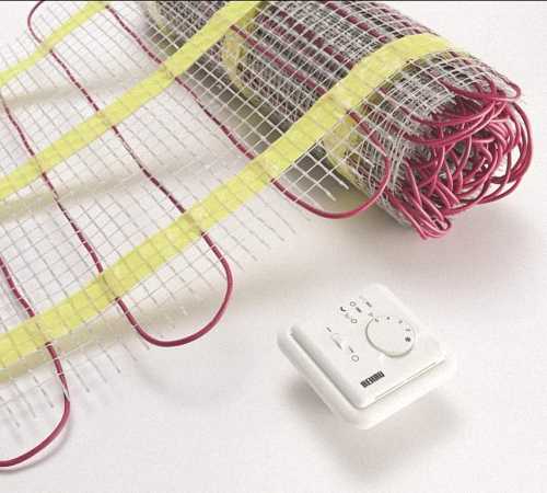 В нагревательных матах кабель уже закреплен, поэтому здесь не нужно вымерять шаг, и монтаж происходит быстрее. Все, что нужно, это разложить и зафиксировать сетку. Часто такой теплый пол укладывается под керамическую плитку. Не нужно заливать стяжку, поскольку слоя клея для плитки хватает, чтобы мат находился в его толще. Если в качестве финишного покрытия используются линолеум, ковролин или ламинат, то требуется минимальная стяжка – 30 мм.