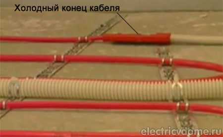 Холодный конец двухжильного нагревательного кабеля просовывается в гофру и устанавливается в изначально подготовленную штробу. Соединительная муфта и начало кабеля закрепляют на полу к монтажной ленте и с этого места начинается укладка кабеля. Причем соединительная муфта должна располагаться на полу таким образом, чтобы она была полностью залита бетонной стяжкой.